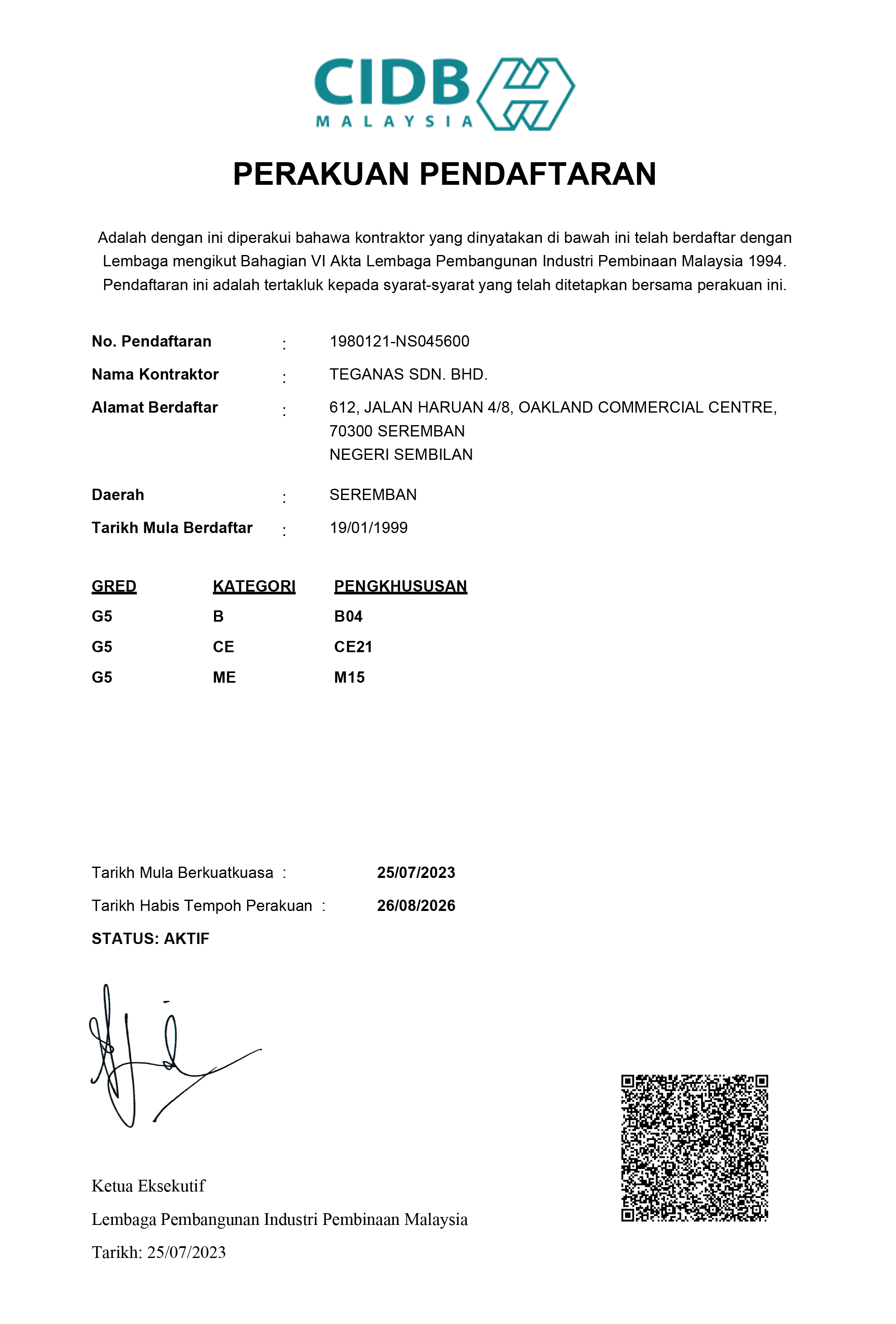 TEGANAS SDN BHD (TSB) was established in year 1996 and registered under Construction Industry Development Board (CIDB) Class CE and B in specialize and expertise in the managing and constructing piping and steel structure work.